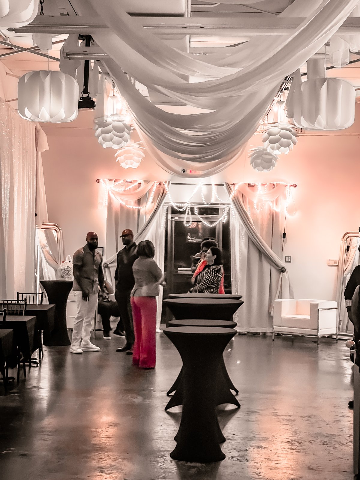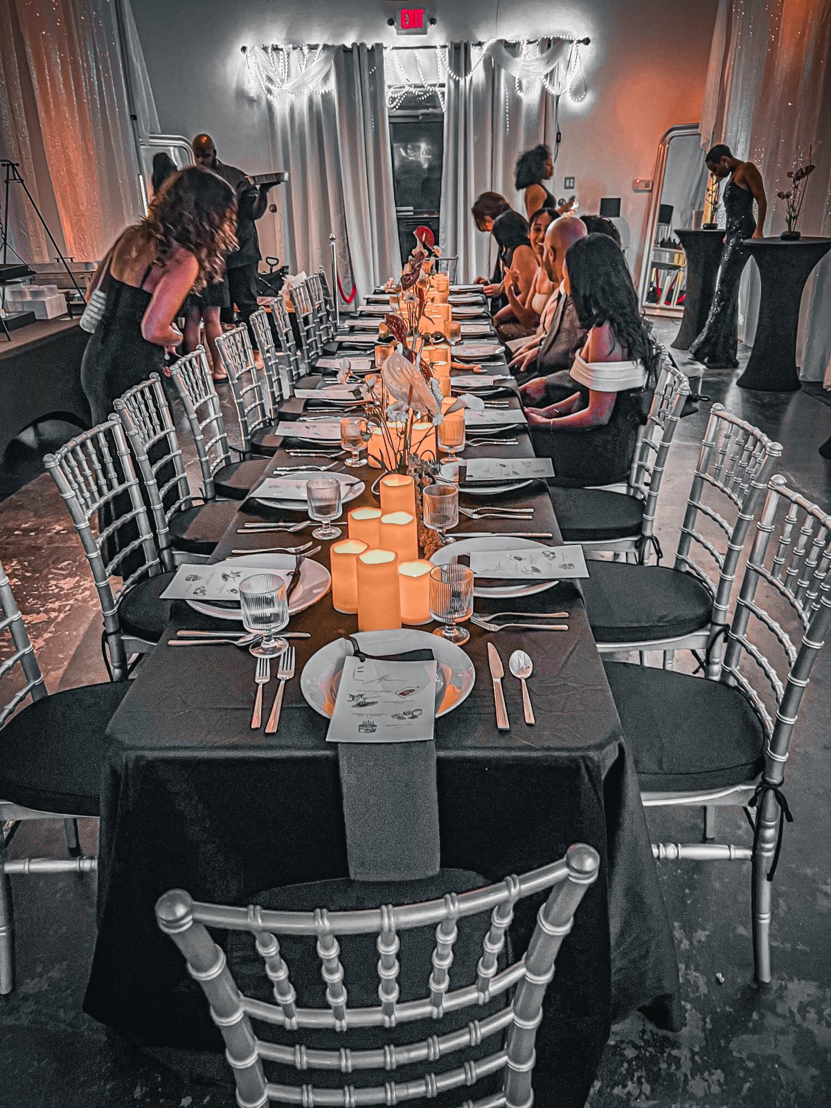 - Black table linens throughout